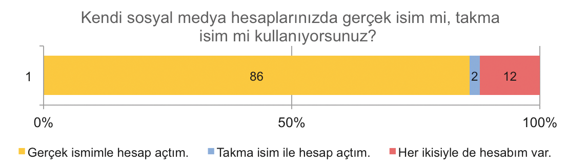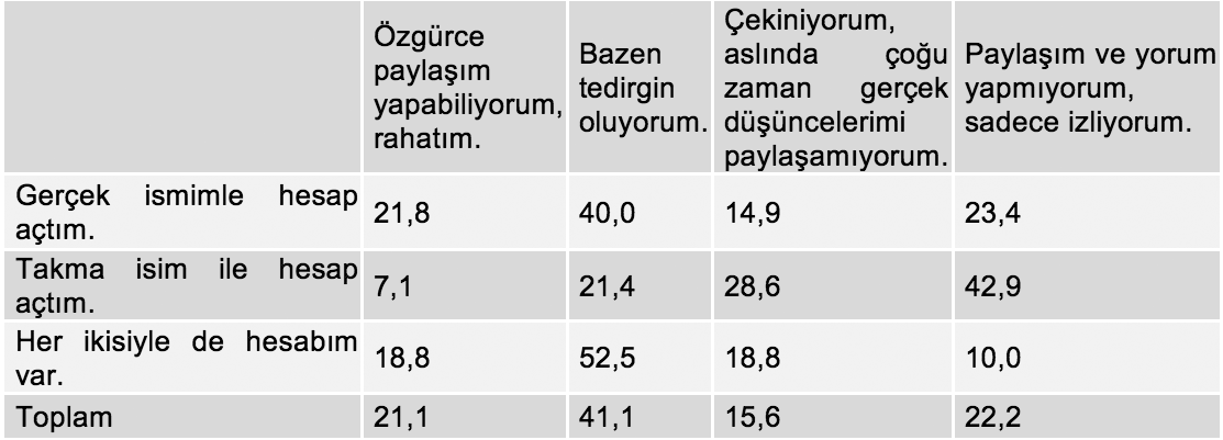 Ankete katılanlar, sosyal medyada görünür olmayı tercih ediyorlar. Katılımcıların yüzde 86’sı gerçek ismiyle hesap açarken, takma isimle hesap açanların oranı yalnızca yüzde 2. Bu görünürlüğe rağmen, özgürce paylaşım yapabildiğini ifade edenlerin oranı yüzde 21,1’de kalıyor. ‘Bazen tedirgin olduğunu’ veya ‘Çekindiği için çoğunlukla gerçek fikrini paylaşamadığını’ ifade edenlerin oranı ise toplamda yüzde 56,7’yi buluyor. Katılımcıların yüzde 55’i ülke yaşamını ilgilendiren politik olaylarda sosyal medyada paylaşımda bulunurken, mensup olduğu toplumu ilgilendiren konu olduğunda bu oran yüzde 44’e düşüyor.