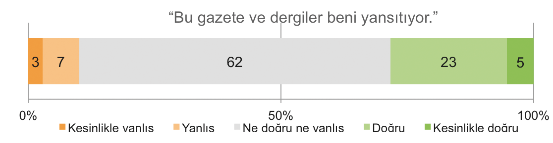 En çok takip edinilen haber kaynaklarında, ulusal yayınları geride bırakan Agos ve Şalom ön plana çıkıyor. Bunun yanı sıra, bu haber kaynaklarına yönelik aidiyet ve temsiliyet durumunu görebilmek için sunulan “Bu gazete ve dergiler beni yansıtıyor” önermesini doğru kabul edenlerin oranı, yüzde 28’de kalıyor. Önermeyi olumsuz karşılayanlar yüzde 10 iken, çekimser kalanların oranı yüzde 62.