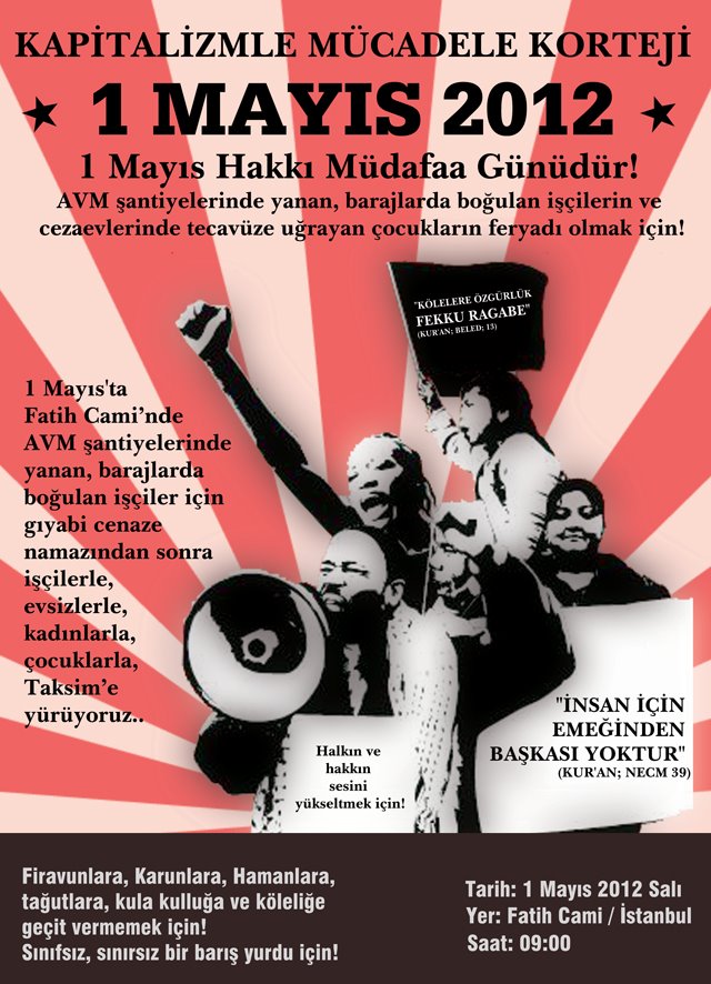 Sosyal paylaşım ağlarında örgütlenen antikapitalist Müslüman gençler 1 Mayıs’a katılmak için çağrıda bulundu. İlk defa yapılan çağrıda; ''Hrantlar, Uludereliler/Roboskililer, Ceylanlar ve daha niceleri hangi suçlarından ötürü öldürüldü' demek için!(...)Katliamlarla, sürgünlerle, tehcirlerle varlıklarına kastedilen Ermeni ve Alevi yurttaşlarımızın hakkı için!' dendi.