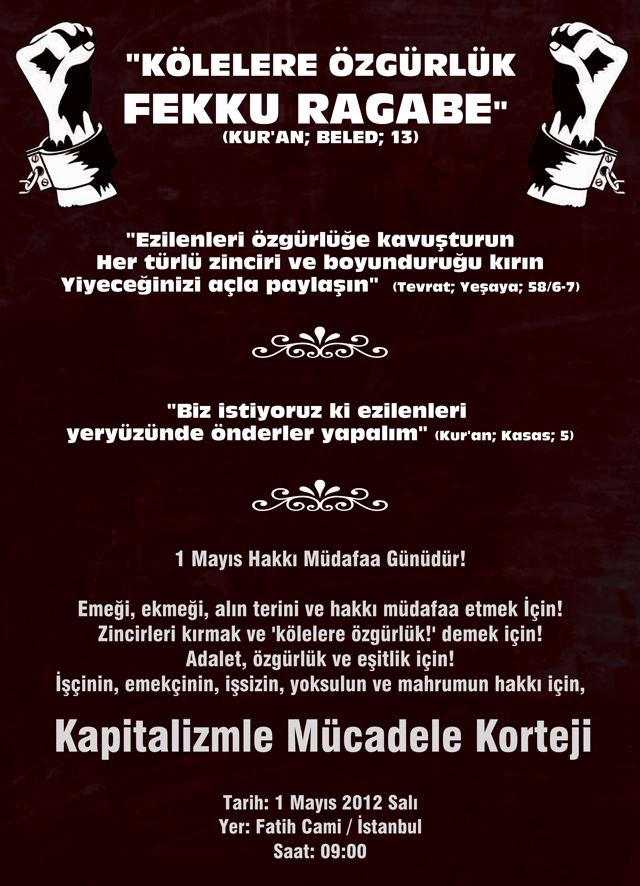 Sosyal paylaşım ağlarında örgütlenen antikapitalist Müslüman gençler 1 Mayıs’a katılmak için çağrıda bulundu. Bir ilk olma özelliği taşıyan ve Kapitalizmle Mücadele Korteji adı altında duyurulan etkinlik büyük destek görüyor.