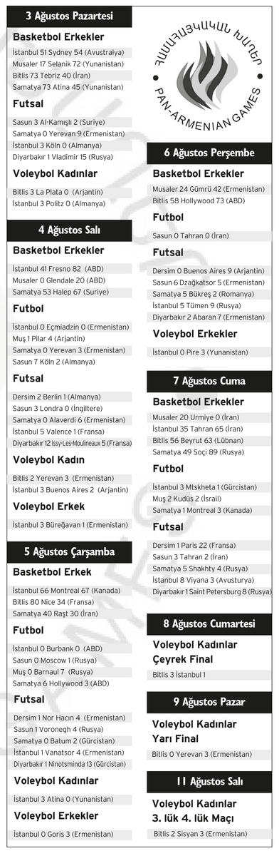 Türkiyeli Ermeniler olarak en kalabalık kafileydik. Ermenistan’da çok özel zamanlar geçirdik. Ancak bu yıl sportif başarı anlamında talihsizlikler yaşadık. Şaibeli bir durumla karşılaştık. Gruptaki son maçların aynı saatte yapılması gerekiyordu fakat saha yetersizliğinden bu mümkün olamadı. Öğlenin 12’sinde yaptığımız maçın ardından Eçmiadzin ile Amerika takımları bizim maç skorumuza göre oynadı. Aralarında anlaştıklarını düşünüyorum ve 0-0 berabere kaldılar, bu sonuçla Amerika ve ekibimizin puanları ve averajları aynı oldu. Yetkililer bir maç daha yapacaksınız ya da kura çekimi yapılacak dedi. Kura çekimi ile hiç adil olmayan bir şekilde Amerika ekibi yoluna devam etti. Bizim için büyük bir tecrübe oldu. Önümüzdeki olimpiyatlar için daha sıkı çalışıp derece almaya çalışacağız.