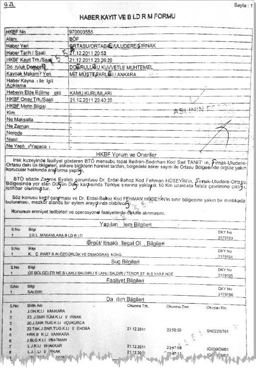 “Olay öncesi elde edilen istihbari duyumlardan bazıları MİT Müsteşarlığından alınmıştır. MİT Müsteşarlığı’ndan alınan duyumlar kendi aralarında olduğu kadar diğer kurumların sağladığı bilgileri de teyit eder niteliktedir. MİT Müsteşarlığı’nca 21 Aralık 2011 tarihinde paylaşılan ve Ortasu/Gülyazı bölgesinde 21-30 Aralık tarihleri arasında bir terörist saldırı gerçekleşeceğini ifade ederek olay günü karar verme sürecinde önemli rol oynayan duyum OBİ- PAS (Operasyonel Bilgi Paylaşım Sistemi) üzerinden alınmıştır.”