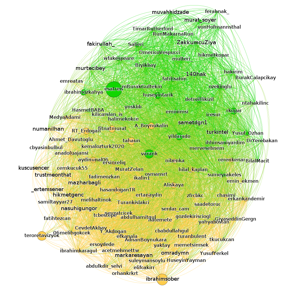 Sonuç olarak AKP’li bürokratlar, politikacılar ve gazetecilerin bir grupta, diğer vatandaşların ve mahlasla yazanların da ikinci grupta toplandığını gördük. İktidar doğrultusunda politik tweetler atan mahlaslı hesapların ise daha çok ikinci gruptan çıktığını gördük. Ulaştığımız ilginç sonuçlardan bir tanesi, analiz içerisinde hiçbir ayrıcalığı bulunmayan ‘Varank’ hesabının, bütün bu ilişkiler ağının merkezinde çıkmasıydı. Bunun da nedeni, iki grupla da olan karşılıklı sıkı bağlantıları.