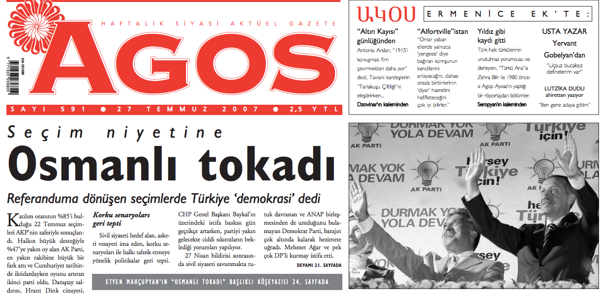 Etyen Mahçupyan, Akşam’daki köşesinde hemen 2 Kasım tarihinde ‘Osmanlı Tokadı’ na atfen “Bu başlığı bir zaman önce Agos’ta 2010 Referandumu’nun sonucunu yorumlamak üzere kullanmıştık. Toplumun siyasi kısır çatışmanın ötesine giderek kendi geleceğine el koymasının ifadesiydi. Bugün bir kez daha aynı noktadayız” deyiverdi. Esasen ‘Agos manşet tarihi’nde kara leke olarak tanımlayacağım bu muhteşem ifade, Mahçupyan’ın çoğul şahıs olarak bahsettiği kendisi tarafından atılmış, yine aynı başlıklı köşe yazısı ile de desteklenmişti. Bu noktada önemsiz bir ayrıntı ama, Mahçupyan herhalde AK Parti’nin oy oranının yarattığı tatlı heyecanla olsa gerek, tarihleri karıştırmış. Bahsi geçen başlığı, 22 Temmuz 2007 Seçimleri sonrası atmış, seçim niyetine ‘Osmanlı tokadı’ manşetini, trajikomik bir alt başlıkla, “Referanduma dönüşen seçimlerde Türkiye demokrasi dedi” şeklinde tamamlamıştı.