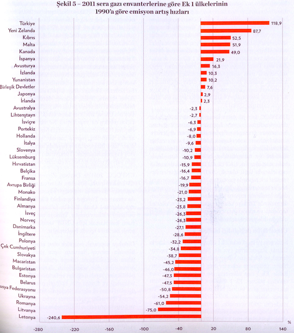 Türkiye iklim değişikliğinin önemini kabul eden bir ülke. Fakat bunun endüstrileşmiş batı ülkelerinin sorumluluğu olduğunu, Türkiye gibi gelişmekte olan ülkelerin onların seviyesine gelene kadar emisyon hakkı olduğunu düşünüyor. Bunun gerekçesi olarak da payının düşük oluşunu (%1) öne sürüyor. Ama bunu söyleyebilecek Türkiye gibi onlarca ülke var. Zaten bütün karbon emisyonlarının yaklaşık yarısını ABD ve Çin, diğer yarısını geriye kalan ülkeler paylaşıyor. Bu ülkelerin çoğunun da payı %1-3 civarında. Türkiye karbon emisyonunda 195 ülke arasında 19. sırada. O kadar da düşük bir seviyede değil yani. Türkiye bugüne kadar karbon emisyonun azaltma sorumluluğunu hiç almadı. İlk defa Paris’te uluslararası bir anlaşmaya katılacak. Nedeni de şu: Paris Konferansı sonrası imzalanacak anlaşma, Kyoto Anlaşması’ndan farklı olarak niyet beyanını esas alıyor. Her ülke kendi yükümlülüğünü kendisi belirleyecek. Türkiye diyor ki “2030’da beklenen emisyon artış hızına göre yüzde 21’e kadar azaltım yapılacak.” Gayet esnek bir beyan, zorlayıcı bir taahhüt değil. Türkiye’nin sözleşmeye dahil olmasının bir diğer nedeni de uluslararası camiada politik bir aktör olarak zor durumda kalması. Ama Türkiye, iklim değişikliğiyle gerçekten mücadele etmek istiyor mu diye sorulacak olsa, hayır, kesinlikle istemiyor.