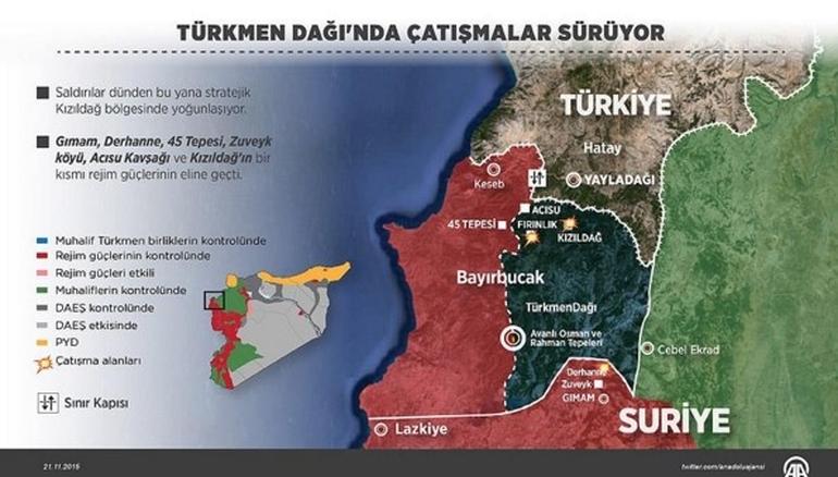 Haberde, "Sabah TSİ 10.45 sıralarında Kessab yamaçlarına çekilmiş olan Esad güçleri tekrar Türkmen Dağı'nın Kızıldağ tepesini top atışlarıyla vurmaya başladı. Dağlık ve ormanlık alana düşen bombalardan yükselen dumanlar sınırımızdan da gözle görülürken, patlama sesleri de Hatay'ın Yayladağı ilçesinden duyuldu" denildi.