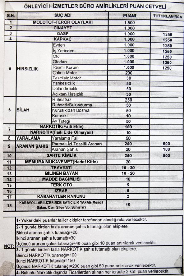 Bu belge ve haberler söz konusu “Bonus sistemi” iddiasını kanıtlar mahiyettedir. Belgede “suç adı” “puanı” ve “tutuklanırsa” başlıklı üç sütunda cinayet, hırsızlık gibi çeşitli suçlar yer almaktadır. Örneğin cinayet için 1000, yankesicilik için 50 puan öngörülmüştür. Ayrıca “Travesti”, “Bilinen Bayan”, “Kabahatler Kanunu”, “Memura Mukavemet” (Hedef Kitle) gibi belirsiz tanımlamalar yapılmıştır.