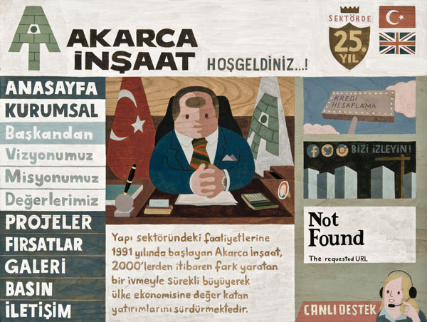 Önceki sergilerinde de şehir dokusunu ağırlıklı olarak işleyen Dinlenmiş, bu sergide, karşısına çıkan, ilgisini çeken gerçek mekânlardan esinle yapmış resimlerini. Ancak mekânlarla kurduğu ilişkinin estetikten ibaret olmadığını belirtmek gerek; yapıtların yanına yerleştirdiği metinlerle, buraların geçmişini de hatırlatarak, bir anlamda, ziyaretçiye rehberlik ediyor. Sergideki tek portre ise, Akarca İnşaat adlı hayali şirketin internet sitesindeki, başkanın mesajıyla birlikte yayımlanan portresi. Dinlenmiş, “Belki de o, burada portresi sergilenebilecek tek figür, çünkü sermayeyi, dönüşümü ve sınıf atlamayı temsil ediyor. Diğerleri ise tarihin yazmadığı karakterler” diyor.