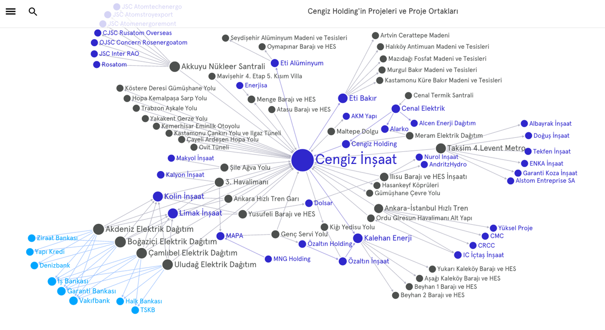 Cerattepe’de halkın yoğun muhalefetiyle karşılaşan maden projesinin müellifi Cengiz Holding, aralarında Akkuyu nükleer santrali, 3. Havalimanı, Menge ve Atasu HES projeleri de dahil olmak üzere, enerji ve inşaat sektöründe tartışmalı pek çok projenin iştirakçilerinden. Mülksüzleştirme ağları ekibi tarafından yapılan ağ haritasına, Cengiz Holding’in üstlendiği projeler şöyle: