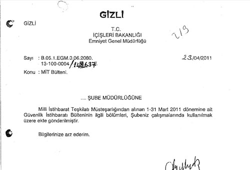 Belge 24 Nisan 2011’de Emniyet Genel Müdürlüğü tarafından, A, B, C ve H Şube Müdürlüklerine, “Milli İstihbarat Teşkilatı Müsteşarlığından alınan 1-31 Mart 2011 dönemine ait Güvenlik İstihbaratı Bülteninin ilgili bölümleri, Şubeniz çalışmalarında kullanılmak üzere ekte gönderilmiştir” üst yazısıyla gönderilmiş. Yazının altında Emniyet Müdürlerinden birinin imzası ve gizli ibaresi de bulunuyor.