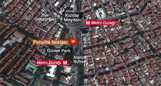 Ankara'da Kızılay Güvenpark yakınlarında 18.45'te patlama meydana geldi. 37 kişinin hayatını kaybettiği saldırıda 125 kişi yaralandı.