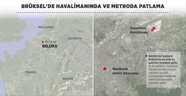 Brüksel'deki Zaventem Havalimanı’nda GMT 8.00'de iki ayrı patlama meydana geldi. Uçuşların tamamı iptal edildi. Havalimanı tamamen boşaltılırken, bölgeye giden giden metro seferleri de durduruldu.