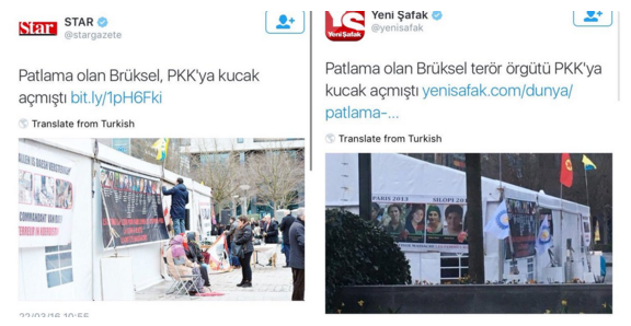 Brüksel’deki saldırının ardından Yeni Şafak ve Star gazeteleri, ‘Patlama olan Brüksel, PKK’ya kucak açmıştı’ ifadeleri içeren tweet’ler atmış, gazeteler bu tweetleri nedeniyle sosyal medyada eleştirilmişti.