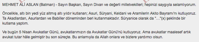 HDP Batman Milletvekili Mehmet Ali Aslan'ın, mecliste kadim Akitu bayramını Süryanice olarak kutladığı konuşması meclis tutanaklarına ‘x’ şeklinde, yani bilinmeyen dil olarak geçti.