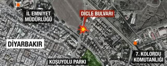 "Diyarbakır-Elazığ Karayolu üzerindeki Kolordu kavşağında polis servis aracına yönelik olarak gerçekleştirildi. Burası 7. Kolordu Komutanlığı nizamiyesine 200 metre uzaklıkta. Yaralılar vatandaşların imkanlarıyla hastanelere taşındı. Yaralılar arasında sivillerin de olduğu öğrenildi."