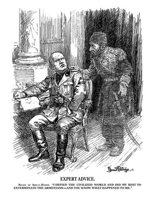 Başlık: “Uzman Tavsiyesi”“Abdülhamit’in gölgesi. ‘Modern dünyaya meydan okudum ve Ermenileri yok etmek için elimden geleni yaptım. Başıma ne geldiğini biliyorsun.’ ”Sanatçı: Bernard Partridge