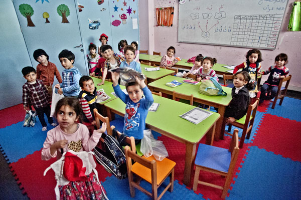 İki bölümden oluşan, kız ve erkek çocukların ayrı ayrı eğitim gördüğü okul karanlık; anlaşılan Bayrampaşa’da bu aralar sık sık elektrikler kesiliyor. Çocuklarsa uslu uslu oturup karanlık sınıflarda elektriğin gelmesini bekliyor. Kızların eğitim gördüğü sınıflarda her şey daha bir sessiz, kızlar kollarını kavuşturmuş sakin sakin bekliyor; kapıdan mahcup selamlaşıyor, karşılıklı el sallıyoruz. Erkekler bölümüne geçtiğimizde uzaktan gelen şamata sesleri elektrikler de gelince iyice yükseliyor; Berge’in sınıflara girmesiyle tüm erkek çocuklar zafer işaretleri ve kocaman gülümsemeleriyle kameraya poz veriyor. Ama nüfusları sanki kız çocuklara göre daha az. Nedenini soruyoruz, Suleyman’ın cevabı “Yaşları kaç olursa olsun erkek çocukların çoğu çalışmak zorunda” oluyor.
