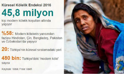 Bugün açıklanan 2016 Küresel Kölelik Endeksi'ne göre 167 ülkede yaklaşık 46 milyon insan modern köleliğin bir türünü yaşıyor. Raporda Türkiye'de 480 bin kişinin kölelik koşullarında yaşadığı belirtiliyor.