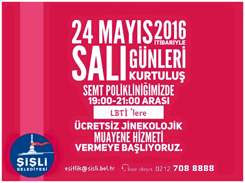 İstanbul Şişli Belediyesi Toplumsal Eşitlik Birimi tarafından, LBTİ’ lere (Lezbiyen, Biseksüel, Transseksüel, İnterseks) ücretsiz ‘jinekolik’ muayene hizmeti 24 Mayıs Salı günü verilmeye başladı.