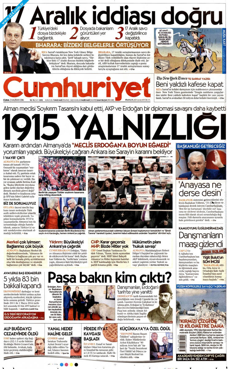 ‘1915 yalnızlığı’ manşeti atan Cumhuriyet, Almanya’da yapılan ‘Meclis Erdoğan’a boyun eğmedi’ yorumlarına yer verdi.