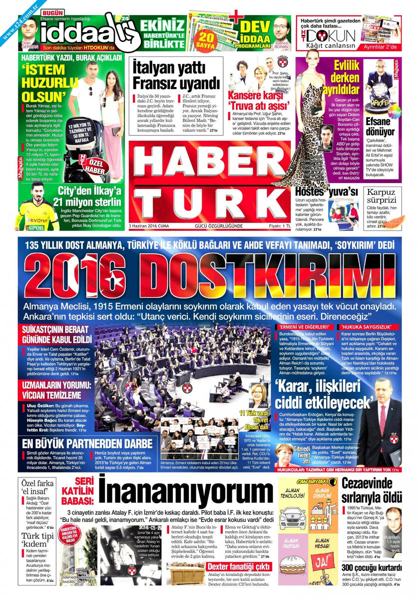 Habertürk ‘2016 Dostkırım’ manşetiyle verdiği haberde Dışişleri’nin ve Erdoğan’ın açıklamalarına yer verdi.
