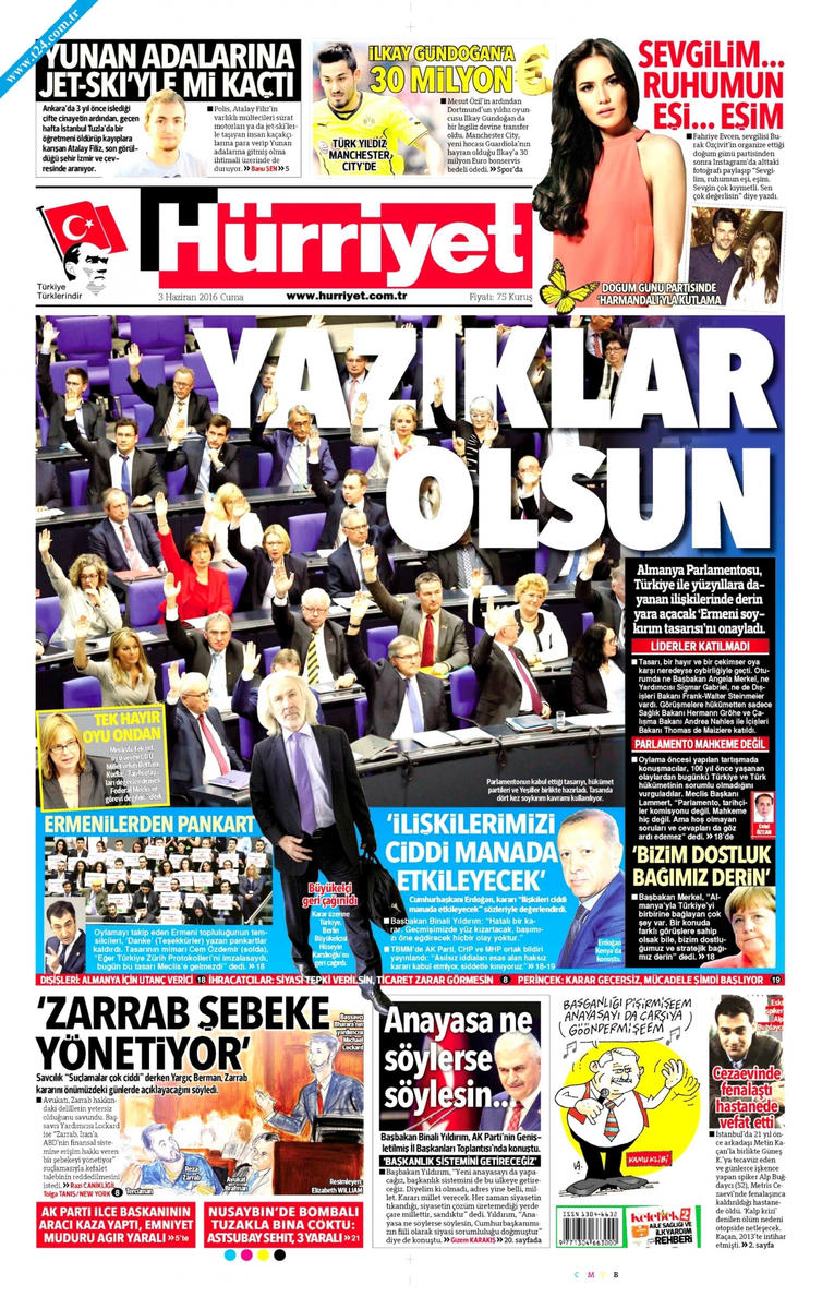 ‘Yazıklar olsun’ manşeti atan Hürriyet, haberde Merkel’in oylamaya katılmadığına değindi, Erdoğan’ın açıklamalarını öne çıkardı.