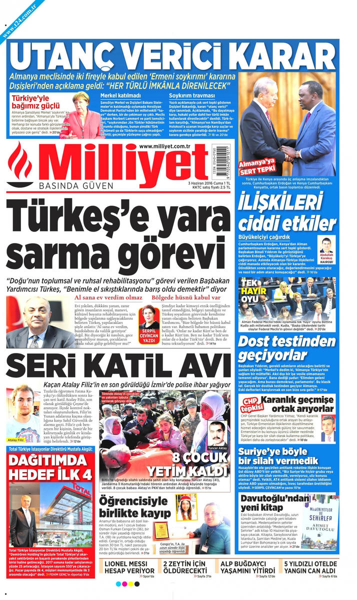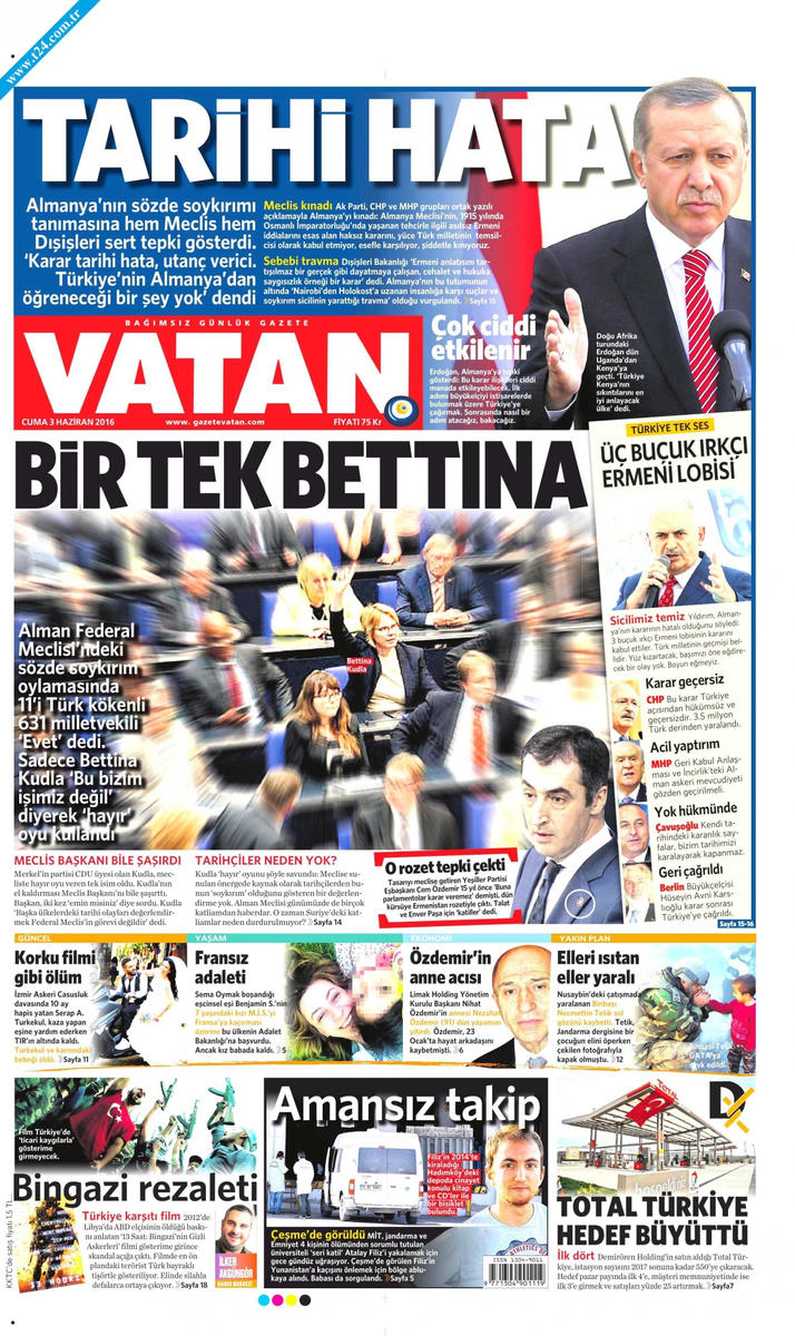 Dün bir ret ve bir hayır oyuyla Almanya Parlamentosu’nda kabul edilen Ermeni Soykırım Tasarısı, Türkiye medyasının manşetlerine nasıl yansıdı?