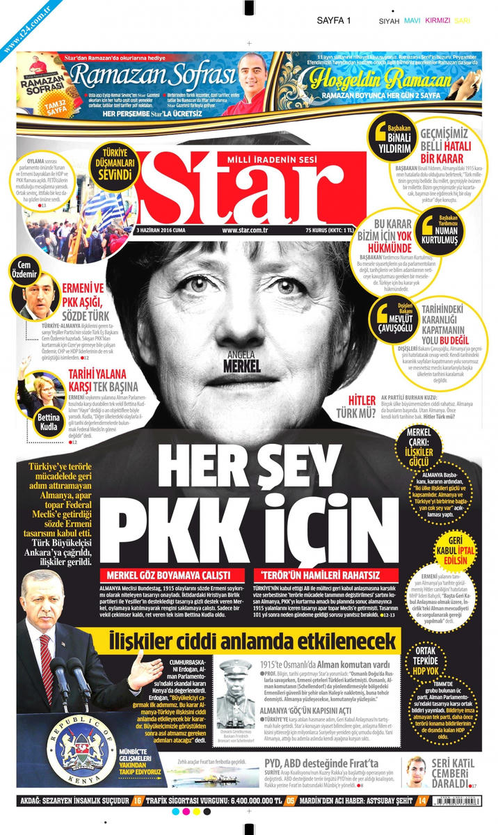 Star Gazetesi’nin manşeti ise sosyal medyada en çok tartışma yaratan manşet oldu. Angela Merkel’i, Hitler’in bıyığından esinlenen bir tasarımla resmeden gazete, ‘Her Şey PKK İçin’ manşetini attı; hem Cem Özdemir başta olmak üzere ‘evet’ oyu veren milletvekillerini hem de meclisteki kınama mesajına imza atmayan HDP’yi hedef gösterdi.