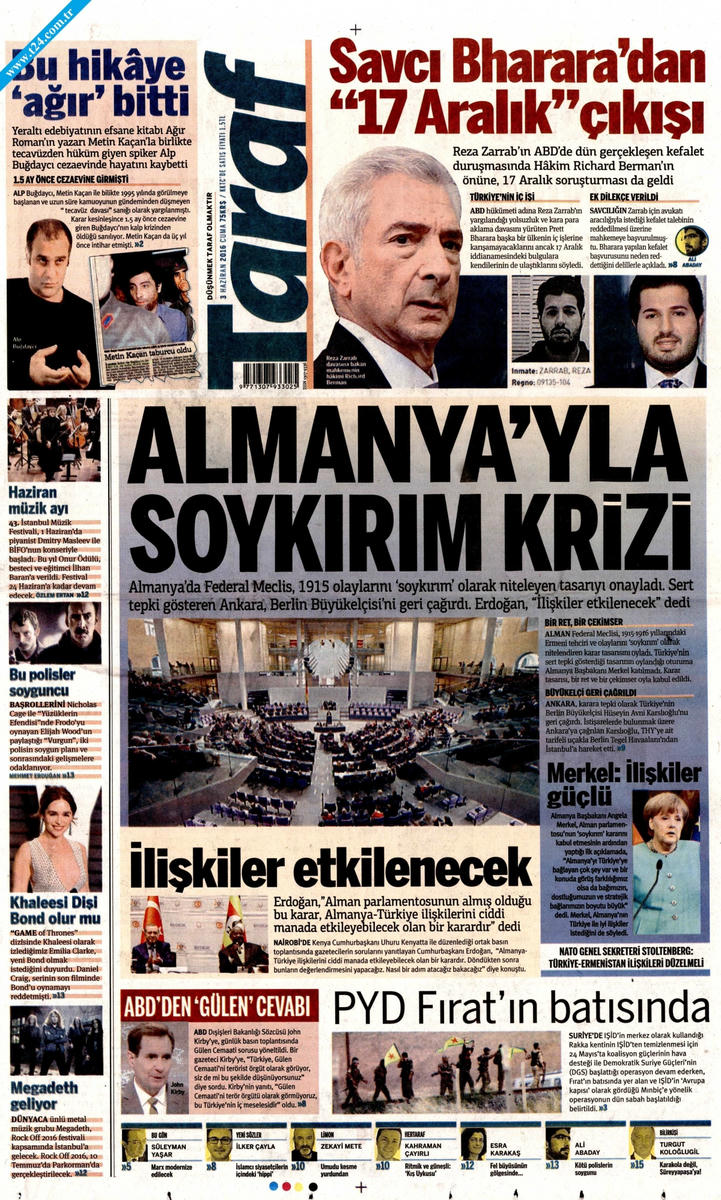 Taraf Gazetesi, ‘Almanya’yla Soykırım Krizi’ başlığını kullandı.