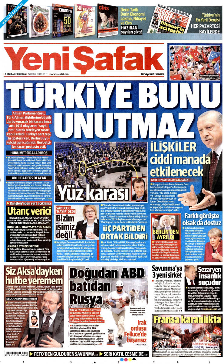 ‘Türkiye Bunu Unutmaz’ başlığını kullanan Yeni Şafak, ‘hayır’ oyu veren tek vekil, Hristiyan Demokratik Birlik Partisi’nden Bettina Kudla’yı öne çıkardı; Yeşiller Partisi Geneş Başkanı Cem Özdemir’i ‘Yüz Karası’ diyerek hedef gösterdi.