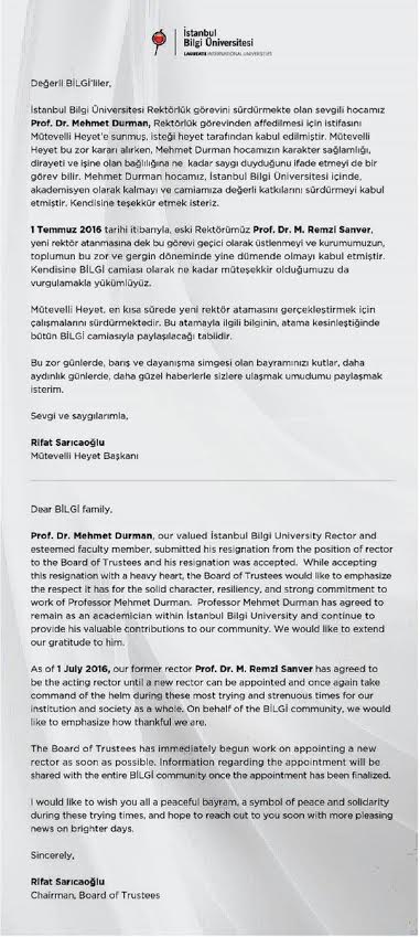 Bilgi Üniversitesi Mütevelli Heyeti Başkanı Rifat Saricaoğlu imzasıyla yapılan açıklamada, Prof. Durman'ın üniversitede akademisyen olarak görevinde devam edeceği belirtildi.