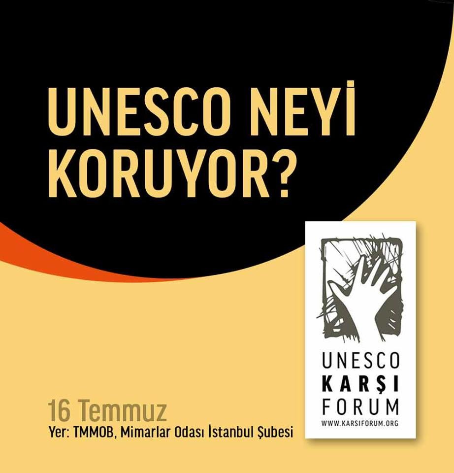 UNESCO Dünya Miras Komitesi’nin 40. oturumu İstanbul’da devam ederken, 16 Temmuz Cumartesi günü 64 sivil toplum kuruluşu İstanbul’da bir karşı forum düzenliyor. Forumda, kentsel dönüşüm ve Güneydoğu’da yaşanan çatışmalar nedeniyle tahrip olan kültürel miras alanlarıyla ilgili UNESCO’nun sorumluluğu irdelenecek.