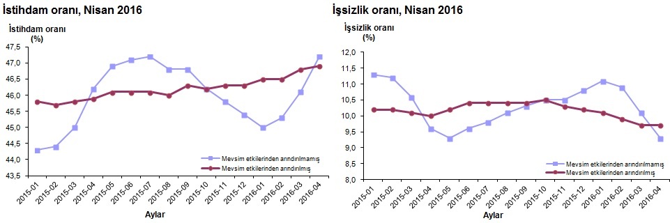 TÜİK verilerine göre, Nisan 2016 döneminde Türkiye genelinde 15 ve daha yukarı yaştakilerde işsiz sayısı 2016 yılı Nisan döneminde geçen yılın aynı dönemine göre 3 bin kişi artarak 2 milyon 824 bin kişi oldu. İşsizlik oranı ise 0,3 puanlık azalış göstererek yüzde 9,3 seviyesinde gerçekleşti. Aynı dönemde; tarım dışı işsizlik oranı 0,6 puanlık azalış görüldü. 15-24 yaş grubunu içeren genç işsizlik oranı 1 puanlık azalış ile yüzde 16 olurken, 15-64 yaş grubunda bu oran 0,3 puanlık azalış ile yüzde 9,5 olarak gözlemlendi.