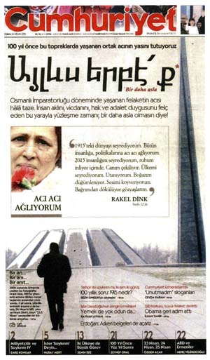 Raporda yer alan üç gazete içinde Cumhuriyet Gazetesi, 2015 yılında Ermeni Soykırımı’yla ilgili haberlere en çok yer veren gazete oldu. Cumhuriyet, sokyırım 100. yıldönümünde, tarihinde ilk defa Ermenice manşetle çıkmış, ‘Bir Daha Asla’ başlığının yanında Rakel Dink’in ‘Acı Acı Ağlıyorum’ yazısına yer vermişti. Fakat Arslan, geçmişle yüzleşmeye açık bir yaklaşım sergileyen bu haberin yanında gazetede nefret söylemine varan manipulatif yazıların da hala yer bulduğunu belirtiyor: “Son yıllarda gazetede köşe yazan Ahmet İnsel, Aydın Engin gibi yazarlar da özellikle geçmişle yüzleşmeye dair iyi örnekler sundular araştırma için. Öte yandan 100. yılda Ermenice manşetle çıkan gazetenin arka sayfalarında bazı köşe yazarlarının Ermenilere yönelik nefret söylemine varan ifadeler kullanmaya devam etmiş olması, diğer gazetelerde olduğu gibi Cumhuriyet’te de Soykırım’a ve yüzleşmeye dair bir direncin hala mevcut olduğunu gösterdi.”