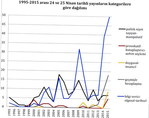 Raporda, Ermeni Soykırımı konusunda 21 yıllık süreçte 24 ve 25 Nisan tarihleri arasında yayımlanan haberler beş ayrı kategoride değerlendirildi. Konu haberleştirilirken yalnızca 5N1K sorularına yanıt veren yayınlar bilgi verici-olgusal-tarihsel; bir politik duruşu yansıtan ve/veya politik duruş bakımından yönlendirici niteliği olan yayınlar politik nitelik taşıyan-manipülatif; kimlikler arası düşmanlık oluşturan ve doğrudan nefret söylemi üreten yayınlar provokatif-kutuplaştırıcı-nefret söylemi; insani değerleri ön plana çıkaran, duygulara vurgu yapan yayınlar duygusal-insancıl ve geçmişle yüzleşmeye dair somut talepler sunan yazılar geçmişle hesaplaşma olarak sınıflandırıldı. Taranan toplam 526 haberin sadece 39’unun geçmişle yüzleşmeyle dair olması dikkat çekiyor. Buna rağmen, araştırma sonuçlarına göre yayınların kategorisinin yıllar içindeki değişimine bakıldığında bilgi verici içeriklerin 2015 yılında önceki yıllara göre artmış durumda. Nefret Söylemi Projesi Koordinatörü Arslan, son yıllarda geçmişle yüzleşme ve duygusal-insancıl kategorilerinde daha fazla yazı üretildiğini söylese de ekliyor; “Öte yandan politik niyet taşıyan-manipülatif kategorisindeki içeriklerin varlığını sürdürmeye devam ettiği tespit edildi. Provokatif-kutuplaştırıcı- nefret söylemi kategorisinde değerlendirilen içerikler de 2015 yılında artış gösterdi.”