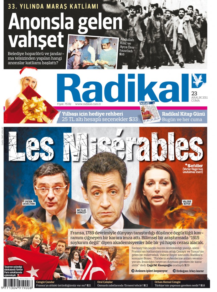 Radikal gazetesinin 23 Aralık 2011 tarihli sayısında Fransa Parlamentosu'ndan geçen “Ermeni soykırımını inkar edenlere ceza” öngören yasa ile ilgili atılan manşete atıfta bulunarak sorulan soru şöyleydi: