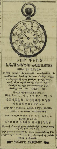 Ermenice gazetelerde bir dönem hanlardaki hareketli hayatı gözler önüne seren bolca ilan da yer alıyordu. 1852-1908 yılları arasında İstanbul’da yayımlanan Masis gazetesinin 1894 yılı 685. sayısında şöyle bir ilana rastlıyoruz. İşte onlardan biri: “Yeni Buluş, Hamidiye Saat, altın ve gümüş, tek akreple Alafranga ve Alaturka saati bir arada gösterir. Böylece ayrı saate bakmaya gerek kalmaz. Yetkili tek bayi, Hovsep Tolanyan’ın mağazası. Burada altın ve gümüş olarak başka saat modelleri, kolyeler ve gümüş tepsiler bulmak da mümkün. Tepsiler beyaz metal üzerine Kritofle yazılıdır. Her ürün özel faturasıyla teslim edilir. Fiyatlar makuldür.”