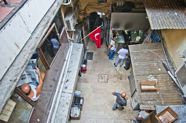Ancak en zor iş tabii çay söylemek. Çünkü sistem şöyle: o kadar merdiveni aşağı iniyorsun, eğer sipariş çok ise çayları kahveleri askıya diziyorsun, dökmeden o daracık merdivenlerden yukarı çıkarıyorsun. Ancak askıyı çaycıya hemen iade etmek gerekiyor. Başlarda askıyı gerivermek için bir koşu yine en aşağı iniyordum, ancak Çarşı’nın bir de çıraklık hukuku vardır. Diğer çıraklar beni uyardılar, ‘Üçüncü kattan avluya salla gitsin’ diye. Kolaymış gerçekten. Artık üçüncü kata kadar iniyor, avluya bakan bir yerden çay ocağına sesleniyor, ocaktan biri ortaya çıkıp ellerini açınca askıyı boşluğa bırakıveriyordum.