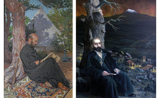 (Solda) 1865’te Van yakınlarındaki Aygestan’da doğup 1941’de Yerevan’da yaşama veda eden, Van direnişinin öncülerinden, Ermenistan’da güzel sanatların gelişimine önemli katkılarda bulunmuş, Yerevan’da adını taşıyan bir güzel sanatlar akademisi bulunan Panos Terlemezyan’ın bu resmi, Gomidas’ı konu alan en ünlü yapıtlardan. Yakından tanıdığı Gomidas’ı gerçekçi bir üslupla resmeden sanatçının üretiminde önemli yer tutan çarpıcı doğa betimlemeleri burada da göze çarpıyor. (Sağda) Edvard Sasun’a ait, ‘Gomidas (1915’te Ermenistan)’ adlı bu eser 2009 yılında yapılmış. Boynunda haç ve elinde şıviyle (bir tür dilli kaval) betimlenen Gomidas’ın düşünceli hali dikkat çekiyor. Onun ne düşündüğünü ve neden bu kadar kederli olduğunu tahmin etmek güç değil. Mumlar, Ermeni Soykırımı’nın sayısız kurbanına gönderme yapıyor.