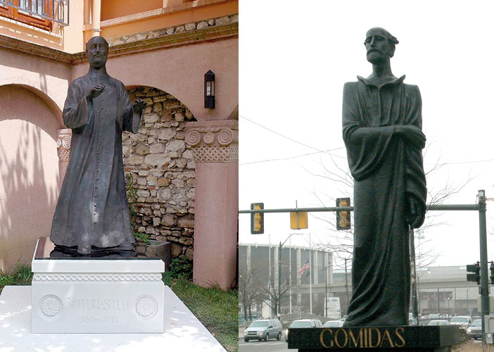 (Solda) İstanbul’da heykeltıraş Erol Sarafyan tarafından yapılan Gomidas heykeli, bu yıl, Beyoğlu Üç Horan Vakfı’nın yöneticilerinin engellemeleri sonucunda, planlananın aksine, kamusal alan niteliğindeki Şişli Ermeni Mezarlığı yerine Türkiye Ermenileri Patrikhanesi’nin bahçesine yerleştirildi. (Sağda) Arto Tchakmakchian’ın tasarladığı, Detroit’teki granit ve bronz Gomidas anıtı, 1981 yılından beri kentin işlek caddelerinden birinde duruyor. Bir buçuk milyon Soykırım kurbanına adanan bu anıt, her yıl 24 Nisan’da anma buluşmalarına sahne oluyor.