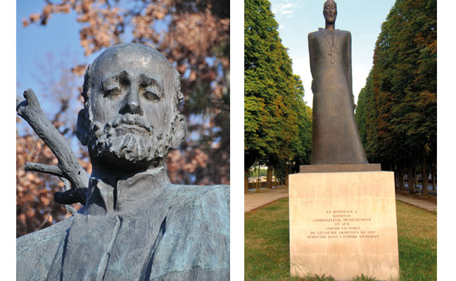(Solda) Gomidas anısına dikilmiş heykellerin en çok bilinenlerinden biri Yerevan’da bulunuyor. Bir ağacın gövdesine oturur şekilde betimlenmiş olan Gomidas’ın üzüntüsü yüzünden okunuyor. Etrafındaki ağaçlarla uyum içindeki heykel, Gomidas’ın adını taşıyan devlet konservatuvarının önünde bulunuyor. (Sağda) Gomidas’ın müziği ve imgesi, akıllara sanatçının acı dolu yaşamının yanı sıra, tüm bu acıların kaynağı olan Ermeni Soykırımı’nı da getirir. Onu konu alan her resim aslında insanlığa adanmıştır; onun betimlendiği her heykel soykırım anıtıdır. 24 Nisan 2003’te Paris’te ziyarete açılan, David Babayan imzalı Gomidas heykelinin aynı zamanda Ermeni Soykırımı anıtı olmasının nedeni de bu. Bu anıtta Gomidas, yalnızca kendi yaşadıklarının değil, 1915’te hayatını kaybeden bir buçuk milyon insanın ve bu gerçeğin açtığı yaralarla yaşamaya mahkûm olan, dünyanın dört bir yanına dağılmış Ermenilerin hüznünü taşır.
