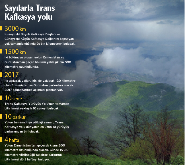 Şu anda, Büyük ve Küçük Kafkasya Dağları’nı dolaşan iki bölümden ulaşan parkurun keşfedilmesi, işaretlenmesi ve haritalandırılması yapılıyor. Ermenistan, Gürcistan ve Azerbaycan’da halihazırda işaretlenmiş yollar da var, bağımsız doğa yürüyüşçülerinın keşfettiği yeni yollar da. Ermenistan ve Gürcistan yürüyüş yollarını birleştiren Küçük Kafkasya yolu yaklaşık bin 500 km uzunluğunda. Bu yolu tamamını keşfettik. Yolun yürüyüşçüler için inşa edilmesi için önümüzdeki yaz Ermenistan’da bir yürüyüş yolu inşa kampı düzenleyeceğiz, bunun sağlamak için de kaynak toplama aşamasındayız. Tahminlerimize göre, Ermenistan ve Gürcistan’da 120’şer kilometre olan ilk bölümleri 2017 sonbaharında açabileceğiz. Bu biraz da başlattığımız fon toplama kampanyasında ne kadar başarılı olacağımıza bağlı.