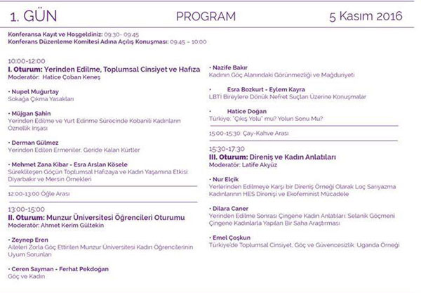 Yerinden edilme, toplumsal cinsiyet ve hafızanın işleneceği ilk oturumda konuşmacılar sokağa çıkma yasaklarının yanı sıra yerinden edilen Ermenileri ve Kürtleri konuşacaklar. Bir diğer oturumda ise Munzur Üniversitesi öğrencileri zorunlu göç deneyimlerini aktaracak.
