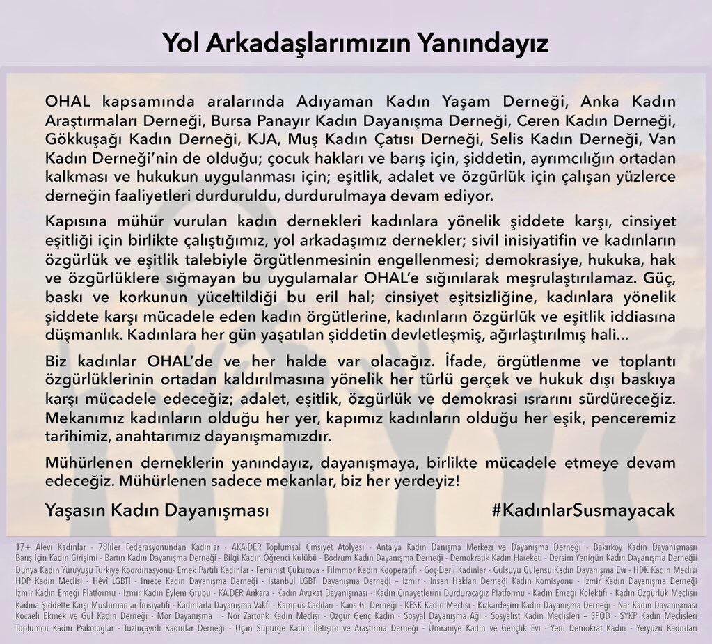 Açıklamada, “kapısına mühür vurulan dernekleri kadınlara yönelik şiddete karşı, cinsiyet eşitliği için birlikte çalıştığımız, yol arkadaşımız dernekler; sivil inisiyatifin ve kadınların özgürlük ve eşitlik talebiyle örgütlenmesinin engellenmesi, demokrasiye, hukuka, hak ve özgürlüklere sığmayan bu uygulamalar OHAL’e sığınılarak meşrulaştırılamaz” dendi.