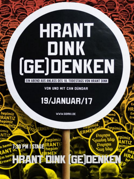 - Berlin’deki Maxim Gorki Tiyatrosu’nda 19 Ocak’ta ‘Hrant Dink’i Anmak ve Anlamak’ başlıklı bir gece düzenleniyor. Anma gecesinde, Can Dündar’ın, Hrant Dink’in yazılarından derlediği metinler, Arsinée Khanjian’ın sahne tasarımı ve Hakan Savaş Mican rejisinde performatif bir okuma olarak sunulacak. Okumanın ardından Collectif Medz Bazar grubunun bir konseri olacak.