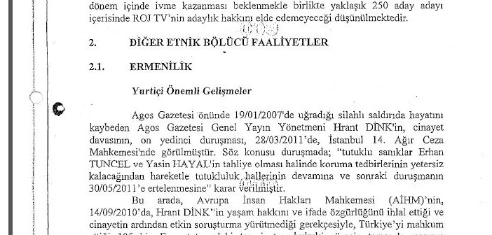 Dink, Agos gazetesini kurduktan sonra takip edilme nedeni de, ‘kategorisi’ de değişti. Hrant Dink, uzun yıllar pasaport alamamış, yurt dışına çıkmasına izin verilmemişti. Çünkü ‘devletin hedefindeydi’; devlet tam olarak öyle tarif ediyordu. Dink öldürüldükten yıllar sonra İstihbarat Şubesinin, ‘’Hrant Dink Ermenilik faaliyetleri kapsamında hedefimizdir’’ diyerek Dink’i takip ettiği ortaya çıktı. Yazının tarihi 1997’ydi. Yani Dink öldürülmeden tam 10 yıl önce...