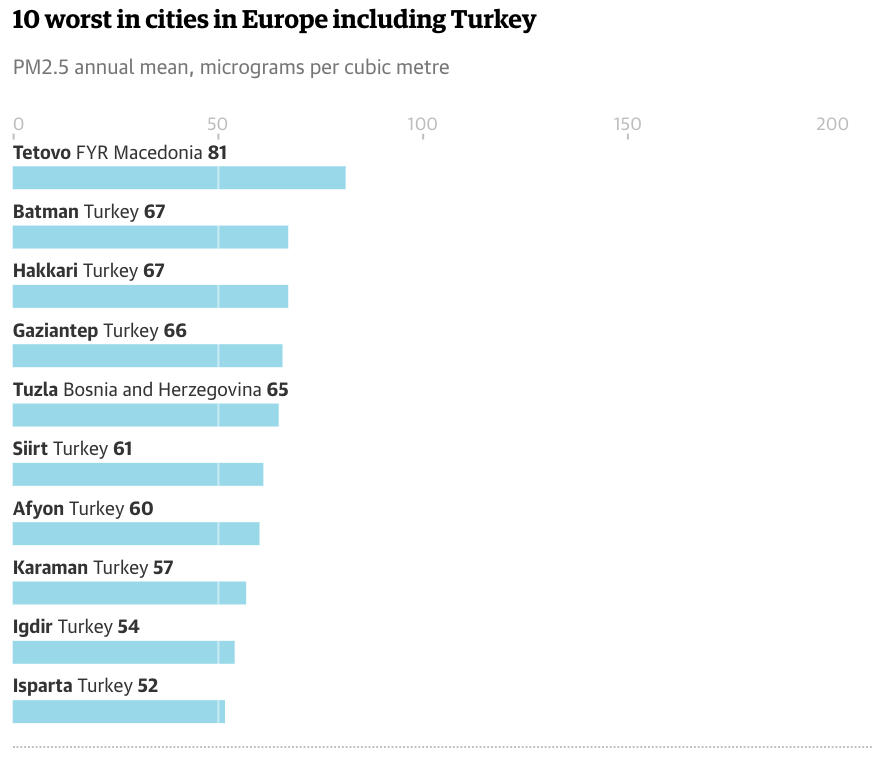 The Guardian, Dünya Sağlık Örgütü verilerini kullanarak PM 2.5 sınırının üstünde yer alan şehirleri haberleştirdi.
