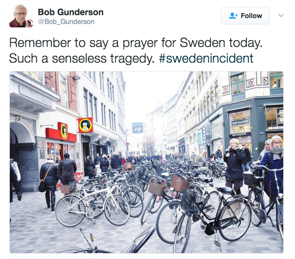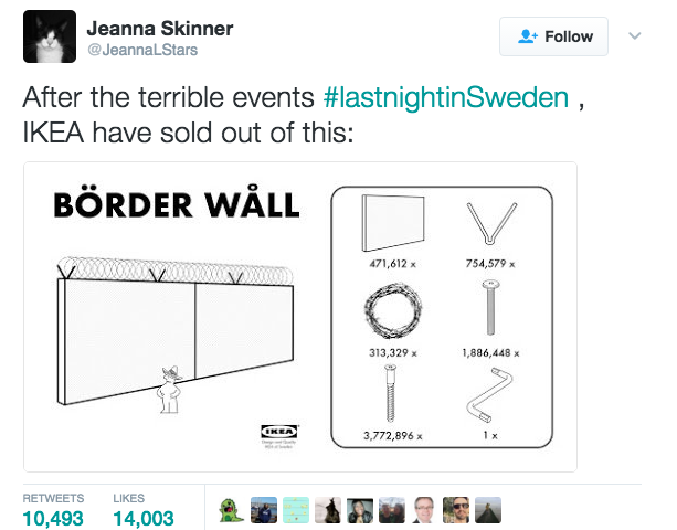 Trump'ın sözleri üzerine kullanıcılar sosyal medyada "#lastnightinSweden (#dünakşamİsveçte) ve #Swedenincident (#İsveçolayı) etiketlerini açtı. Kullanıcılar İsveç'te üst üste yığılmış bisikletler, yere çöp kovası atan bir adam gibi görseller paylaşarak 'İsveç için üzücü bir gün' yazan mesajlar paylaştı; İsveç'in meşhur grubu ABBA'nın görselleri 'dört radikal aranıyor' denerek paylaşıldı.