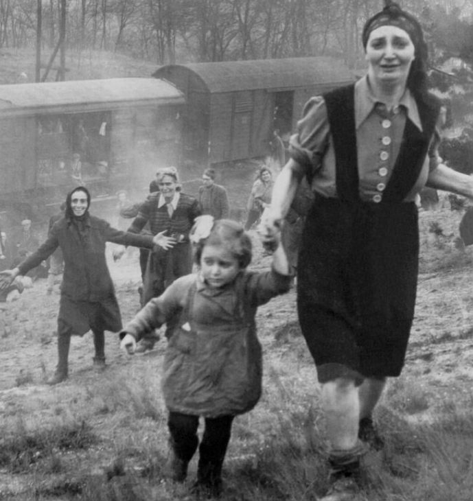 20. yüzyılın en güçlü fotoğraflarından biri olarak bilinen ve şüphesiz Holokost’un en etkili karelerinden birinde, bir kadın ve küçük bir kız, Amerikan birliklerinin kurtardığı bir trenden yukarı doğru koşuyor.