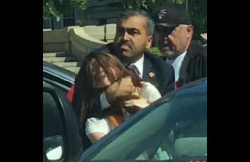 Korumalardan bazıları protestocuların elindeki bayrakları almaya çalıştı, bir koruma, eylemci kadının boğazını sıktı, başka korumalar protestocuları darp etti.